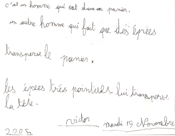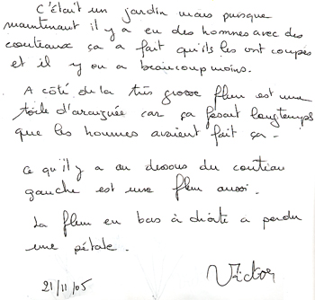 Victor m'a expliqué qu'il avait demandé à son père où il allait avec cet arme et qu'il lui avait répondu "qu'il allait tuer tous les animaux de la fôret". Sur ce, la voiture de cet homme redescend le chemin, je sais maintenant qu'il a l'arme dans la voiture, avec lui. Je prends donc mes enfants sous les bras, je les porte et cours me recacher chez ma belle soeur.