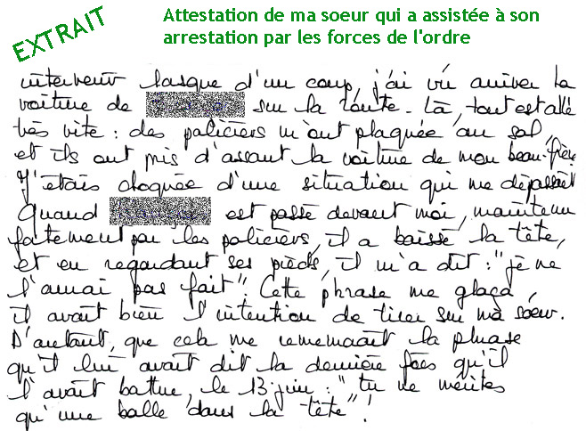 La police fini par arriver, le maîtrise, l'embarque. A ce moment ma soeur est présente, il passe devant elle avec les menottes, la tête défaite, basse et dit : "je ne l'aurais sûrement pas fait..."