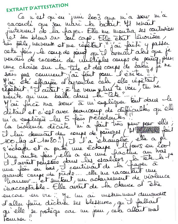 Pour Marie, sa soeur, cela a été encore plus rapide, elle a entamé une discussion téléphonique, mais quand il a compris le sujet de son appel il a raccroché en gueulant. Elle a tenté de le rappeler sans succès. Marie était retournée et avait peur de l'état psychologique de son frère. Elle me disait qu'il allait faire une connerie s'il me voyait car avait dit des phrases de menaces grave contre moi. Elle m'a encore appellé pour me dire de me protéger et que son frère jumeau qu'elle venait d'avertir n'arrivait pas, lui non plus à le joindre.