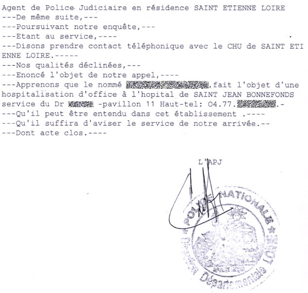 Il est interné aux urgences psychiatrique le 18 juin 2003 en fin de soirée. Puis envoyé à l'hôpital psychiatrique de Saint-Jean-Bonnefond en hospitalisation d'office.